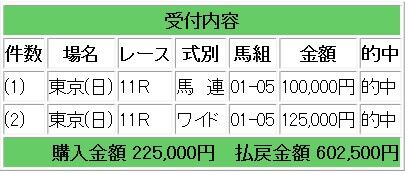 会員様には2ベンチャーアウトからのワイド2点指示で4.5倍的中となり、22万5000円の払い戻しとなりました。
