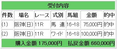 会員様には16タイトルホルダーと18ディープボンドの馬連、ワイド各1点指示で5.2倍、2.7倍ダブル的中で66万円の払い戻しとなりました。