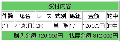 会員様への情報提供時は単勝 3.8倍となっていましたが、確定オッズは2.6倍となり、単勝的中で31万2000円の払い戻しとなりました。