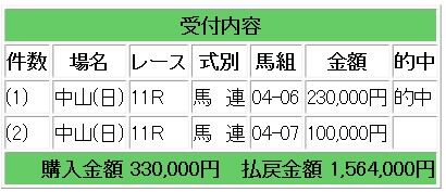 会員様には上記情報馬のワイド1点、12ピアシックの複勝1点指示でダブル的中となり、33万円の払いも戻しとなりました。