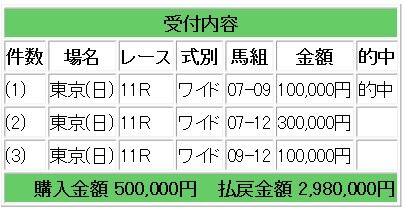 上記情報馬のワンツー決着となり、馬連7.7倍的中、ワイド2.3倍的中で50万円の払い戻しとなりました。