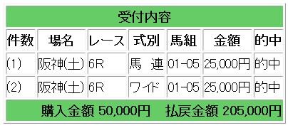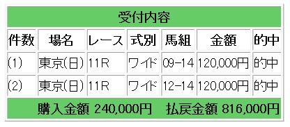上記2頭の馬連・ワイド指示となり、20万5000円の払い戻しとなりました。