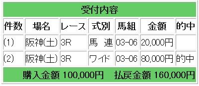 会員様には危険な人気馬タマモロックを切り捨てた馬連、ワイド各1点指示で2.8倍的中となり、19万6000円の払い戻しとなりました。