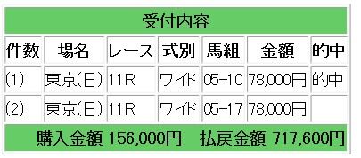 オークスは馬連・ワイドダブル的中で85万円獲得