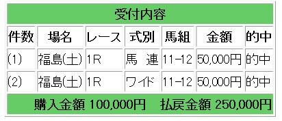 上記2頭のワンツー決着となり、馬連3.5倍的中、ワイド1.5倍的中で25万円のお払い戻しとなりました。