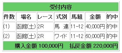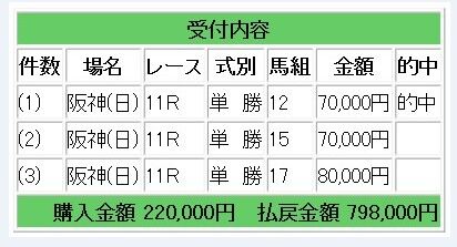 上記情報馬のワンツー決着となり、馬連3.1倍的中、ワイド1.6倍的中で22万円の払い戻しとなりました。