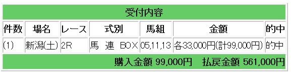 上記情報馬の馬連ボックス指示で17倍的中となり、56万1000円の払い戻しとなりました。