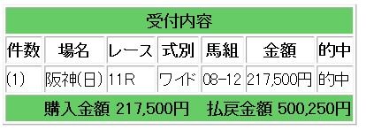 上記2頭のワイド1点指示で2.3倍的中となり、50万250円の払い戻しとなりました。