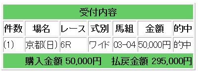 上記2頭のワイド指示で5.9倍的中となり29万5000円の払い戻しとなりました。