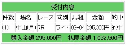 上記2頭のワイド1点指示で3.5倍的中となり、103万2500円の払い戻しとなりました。